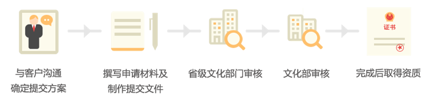 1、完成网络文化经营许可证的资料填写及文件制作; 2、提交至省级文化部门进行审核; 3、提交至文化部进行审核; 4、通过后领取网络文化经营许可证 |