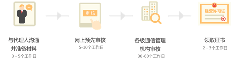 1、完成ICP经营许可证资料填写及文件制作; 2、与通信管理部门沟通,反馈修改意见; 3、最终领取ICP经营许可证; |