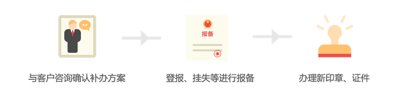 1、登报、挂失等丢失报备流程;2、工商代办新印章、证件;